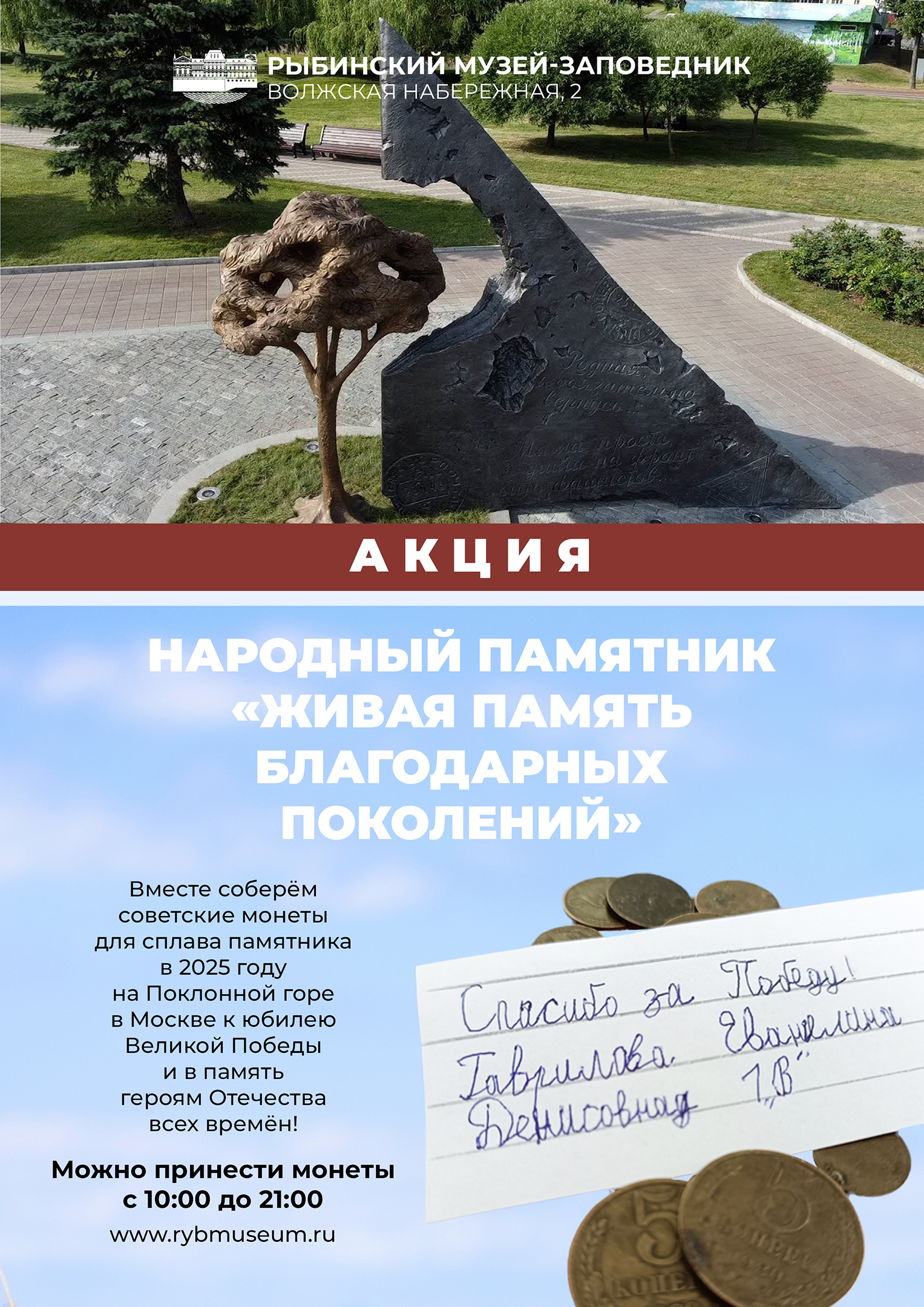 Главная идея акции – личное участие каждого жителя России, каждой семьи в сборе монет советской чеканки для создания памятника о всенародном подвиге наших предков. Для сбора монет в музее установлена специальная колба и будет вестись дневник акции.