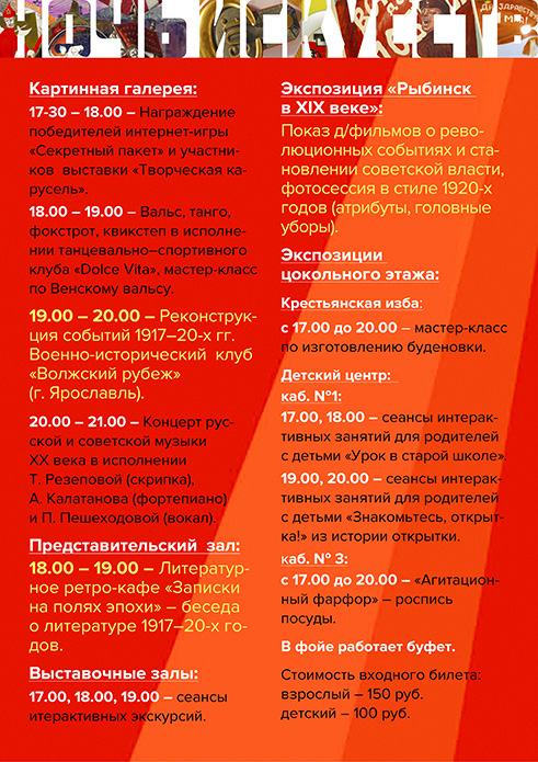 19.00 – 20.00 – Реконструкция событий 1917–20-х гг. Военно-исторический клуб «Волжский рубеж»