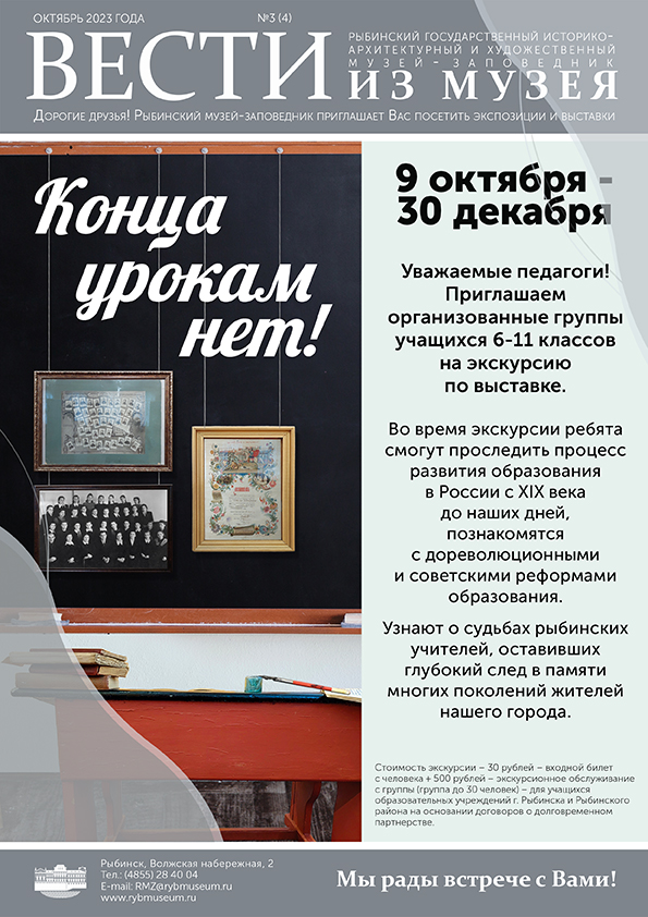 Уважаемые педагоги! С 9 октября по 30 декабря Рыбинский музей-заповедник приглашает учащихся 6-11 классов на экскурсию по выставке «Конца урокам нет».