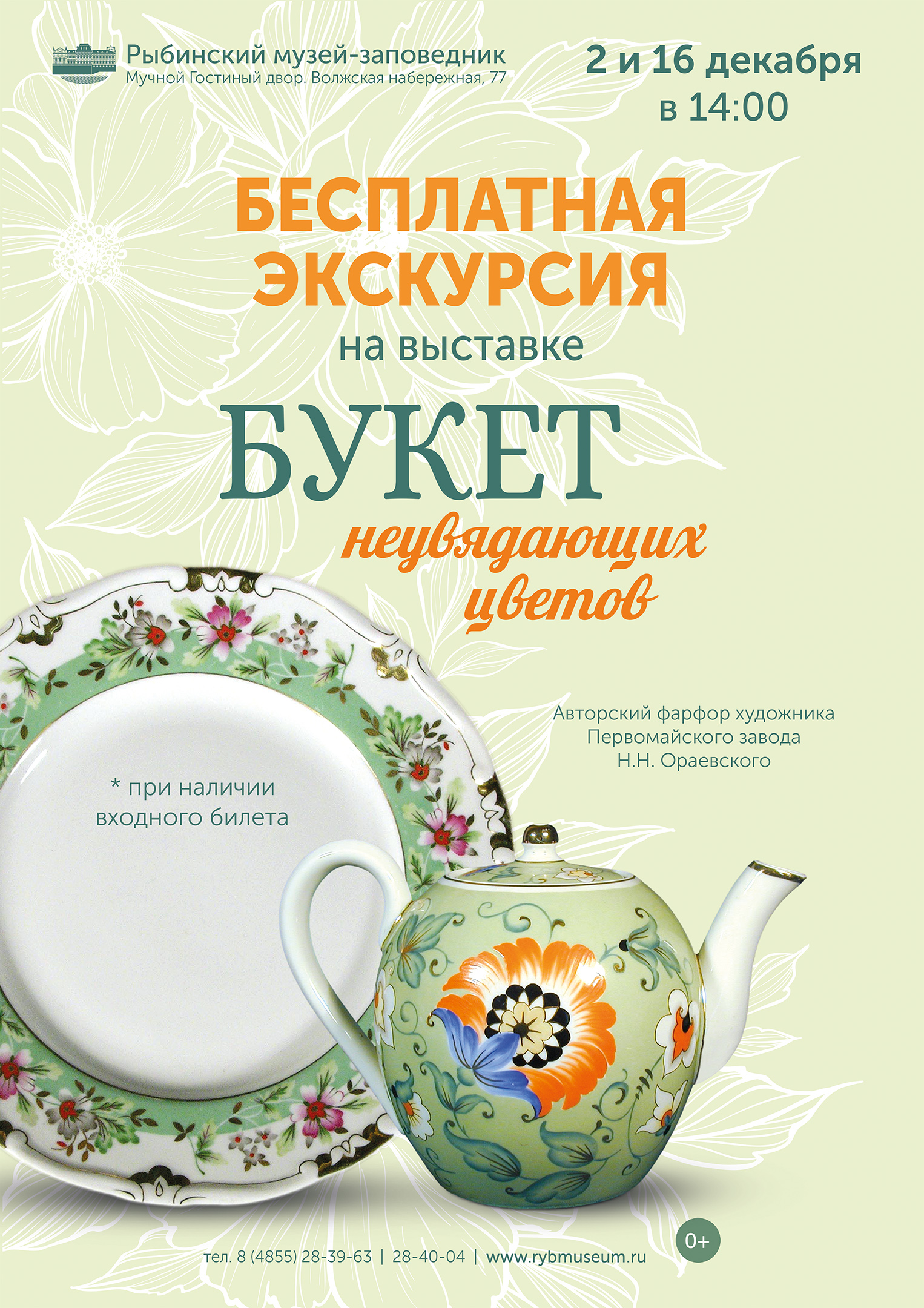 Приглашаем на сеансы «кураторских экскурсий» 2 и 16 декабря 2023 года (суббота) в 14:00 на выставке «Букет неувядающих цветов: Авторский фарфор художника Первомайского завода Н.Н. Ораевского. К 120-летию со дня рождения».