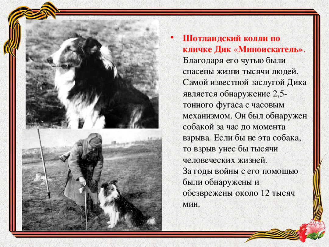 Собаки-миноискатели – эти живые радары обследовали и разминировали территорию, равную 15153 км., обнаружили и обезвредили свыше 4 миллионов мин и фугасов.