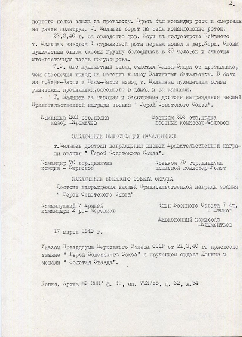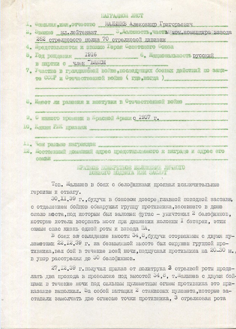 Младший комвзвод Александр Малышев в январе 1940 года, выполняя задачу не допустить отхода врага из города Виипури (ныне — Выборг Ленинградской области) вдоль побережья Выборгского залива, возглавил взвод, который во взаимодействии с другими подразделениями роты разгромил штаб батальона противника в районе города Койвисто (ныне — Приморск Ленинградской области). 27 февраля 1940 взвод под командованием А. Г. Малышева первым ворвался на окраину населённого пункта Кери, расположенного северо-западнее Койвисто, а 7 марта 1940 года — на остров Сантасаари, чем обеспечил выход батальона к мысу Валиниеми, находящемуся юго-западнее Виипури.
