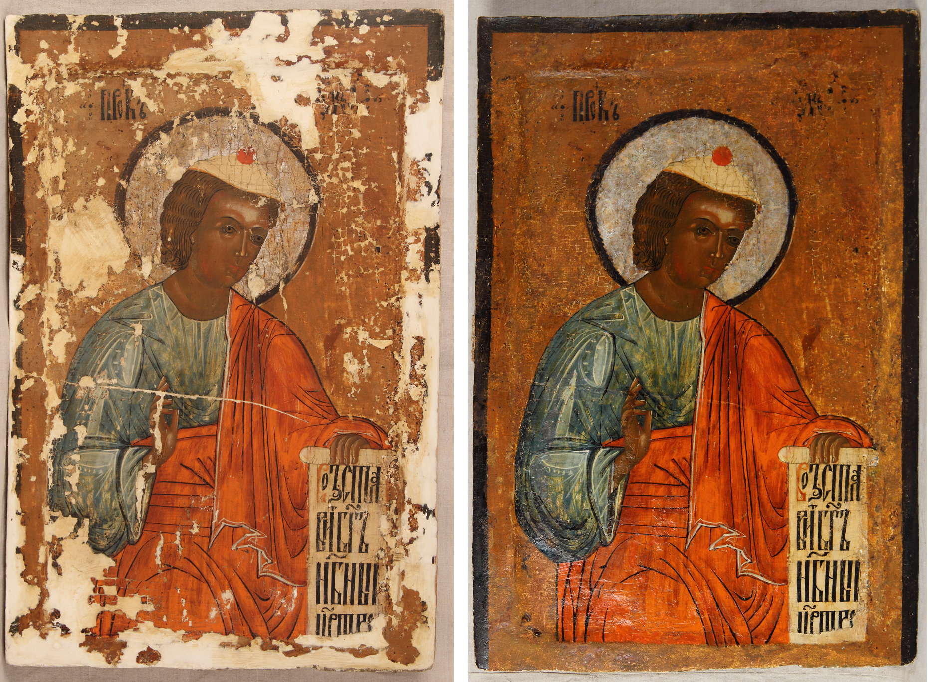В процессе реставрации была восстановлена связь красочного слоя и грунта, максимально, насколько это было возможно, уложен кракелюр в плоскости красочного слоя, были удалены поверхностные загрязнения. Стал тоньше и ровнее слой олифы. В места утрат левкаса был подведен реставрационный левкас.