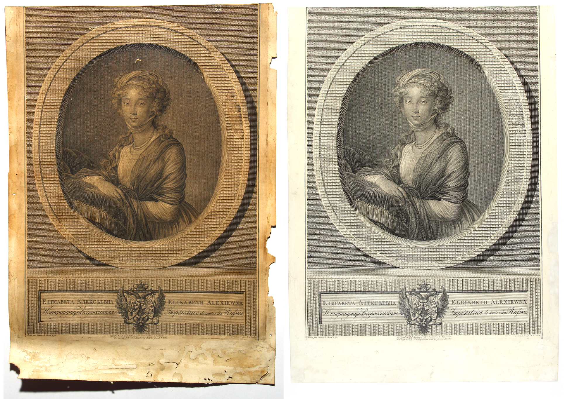 Реставрация музейных предметов. Клаубер И. Гравюра. Портрет Елизаветы Алексеевны, Императрицы Всероссийской