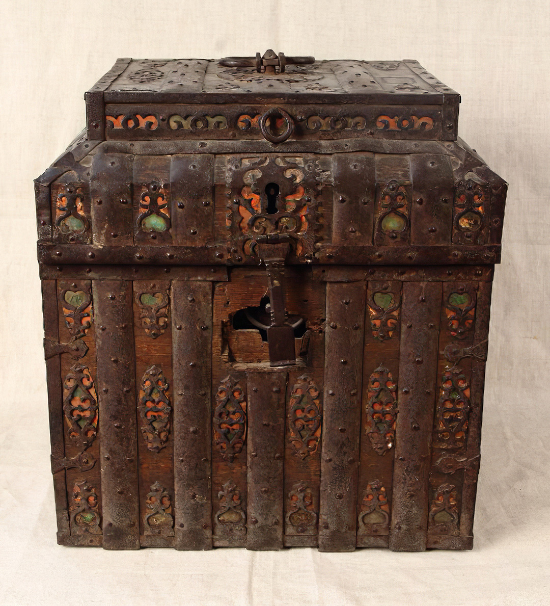 Чтобы сохранить ценности, спрятанные внутри, сундуки снабжали запорами: врезными (часто имеющими секретные механизмы) или навесными замками.