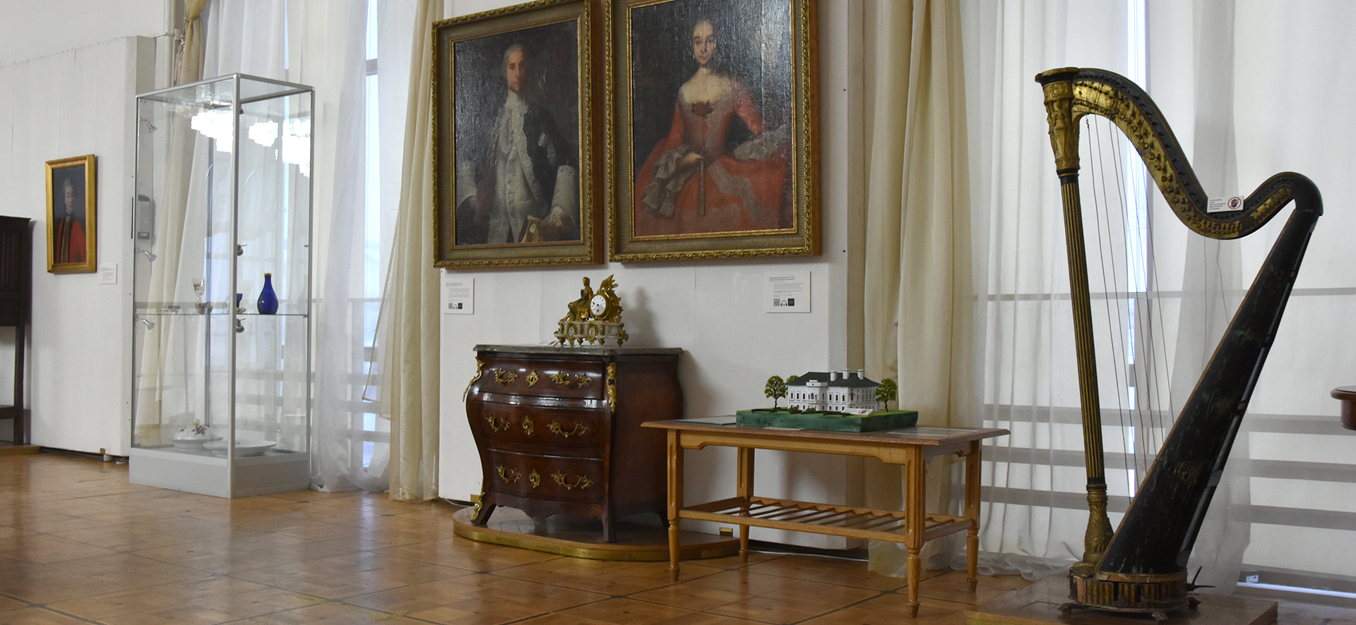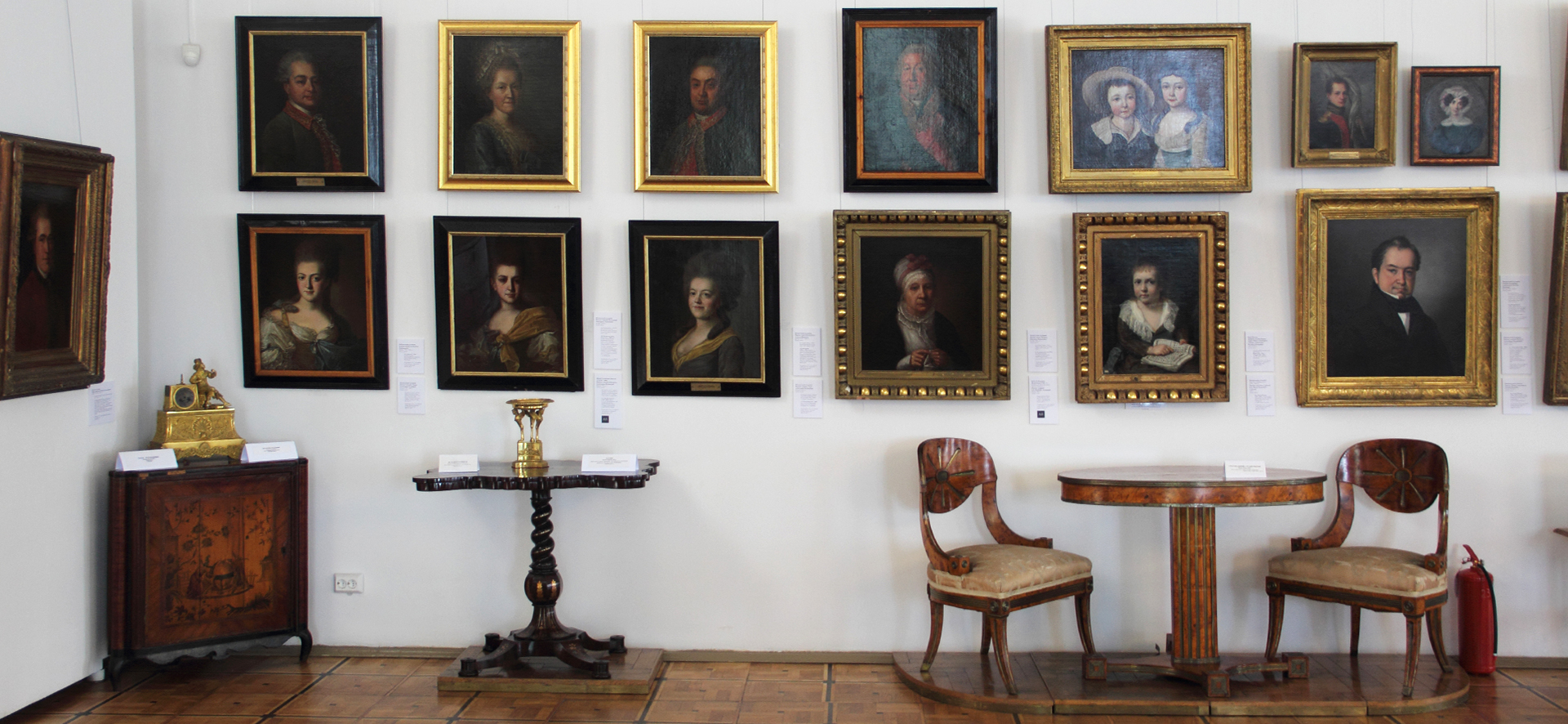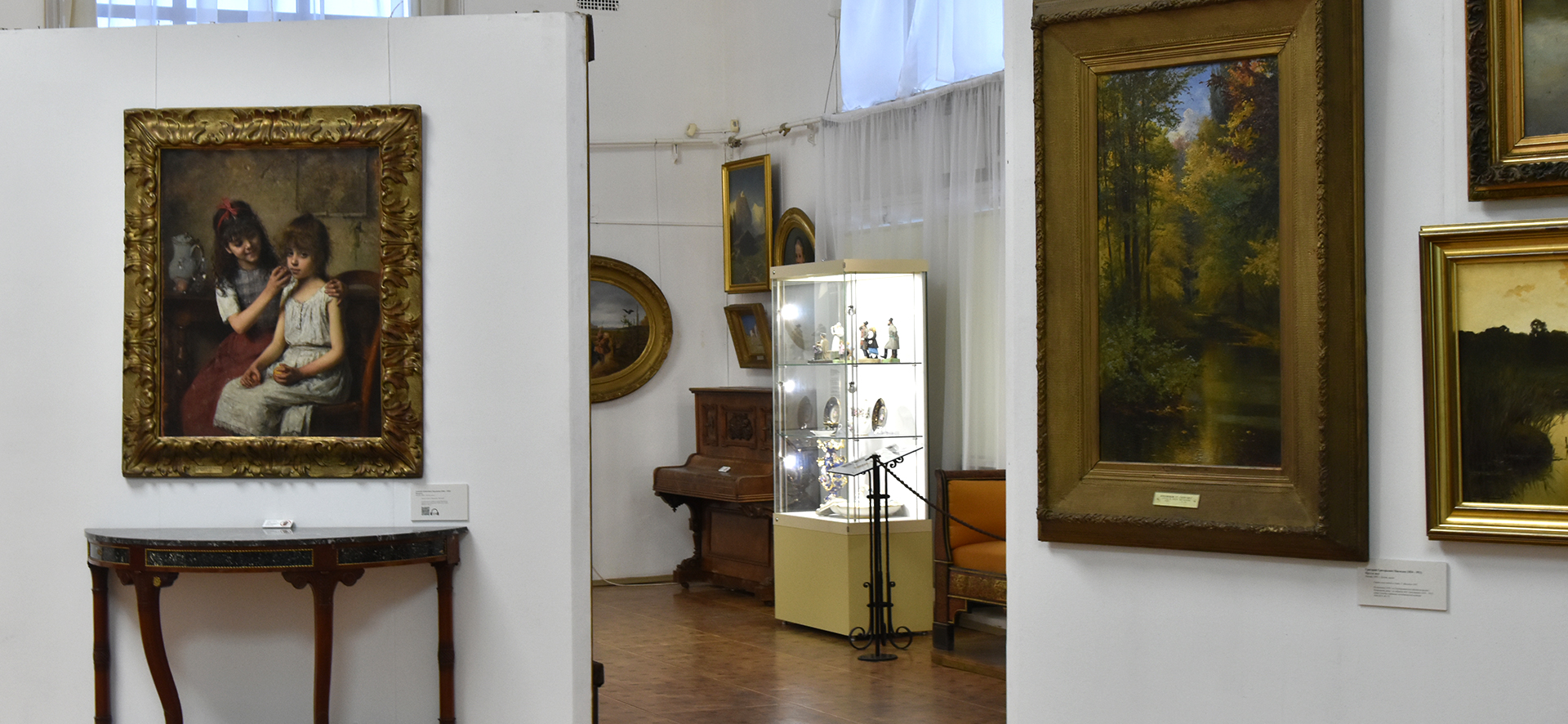 В экспозиции находятся лучшие произведения из наиболее полно представленных в музейном собрании усадебных картинных галерей: Мусиных-Пушкиных, Тишининых, Лихачёвых, Михалковых, среди которых есть работы известных русских художников 18 в. – И.Вишнякова «Портреты Н.Тишинина, К.Тишининой», Ф.Рокотова «Портрет Е.А.Мусиной-Пушкиной», Е.Камяженкова «Портреты Я.Лихачева, В.Лихачева» и др. Искусство 1-ой половины 19 века представлено академическими пейзажами Ф.Матвеева «Вид в Италии», «Водопад», жанровой и портретной живописью В.Лучанинова «Благословение ополченца», Д.Доу «Портрет Александра I», Ш.Митуара «Портрет госпожи Альбрехт» и др. Значительную часть собрания составляют произведения художников-передвижников 2-й половины 19 века – жанровая живопись А.Корзухина «Девочка», В.Маковского «Два малоросса», А.Попова «Спор», отражающая остро-социальные проблемы своего времени, реалистические пейзажи И.Шишкина, Г.Мясоедова, Н.Пимоненко, раскрывающие неброскую красоту русской и украинской природы. Небольшой раздел русского искусства конца 19 – начала 20 веков представлен известными работами З.Серебряковой «Автопортрет с дочерьми», П.Кончаловского «Хлебы на фоне подноса», С.Жуковского «Подснежники», И.Бродского «Фейерверк» и другими. Дополняют экспозицию бронзолитейная скульптура П.Клодта «Юноша, укрощающий коня», Е.Лансере «Киргизский табун на водопое», произведения декоративно-прикладного искусства – мебель, выполненная русскими и зарубежными мастерами 18–19 веков, а также коллекция русского фарфора 18-19 веков.