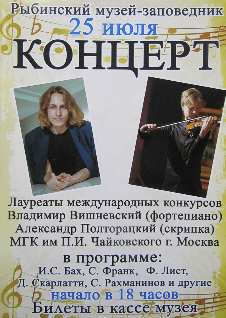 25 июля состоится концерт классической музыки в картинной галерее музея. Исполнители: лауреаты международных конкурсов Владимир Вишневский (фортепиано) и Александр Полторацкий (скрипка) МГК им. П.И. Чайковского г. Москва.