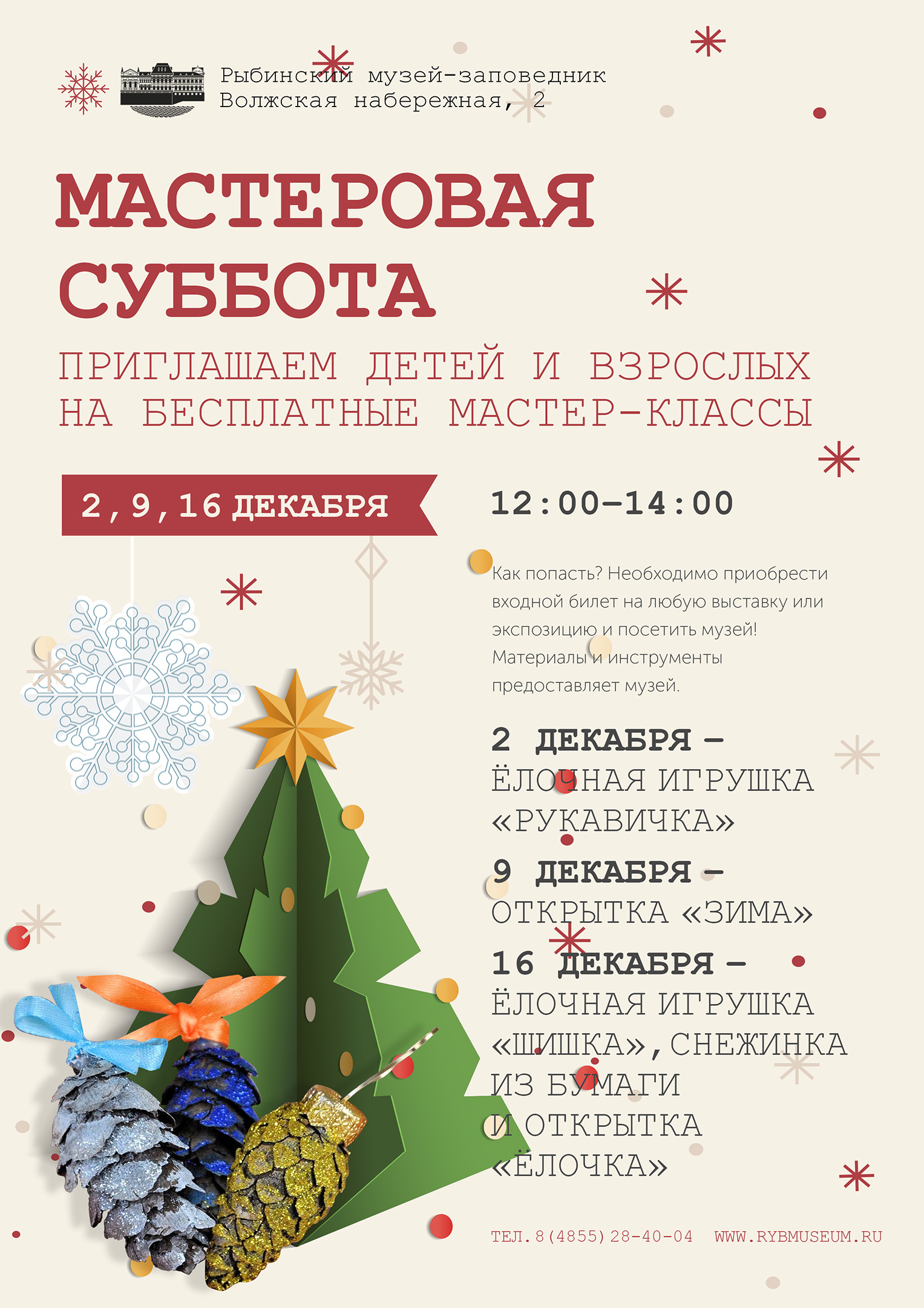 2, 9 и 16 декабря 2023 г. с 12:00 до 14:00 приглашаем детей и взрослых на бесплатные мастер-классы.