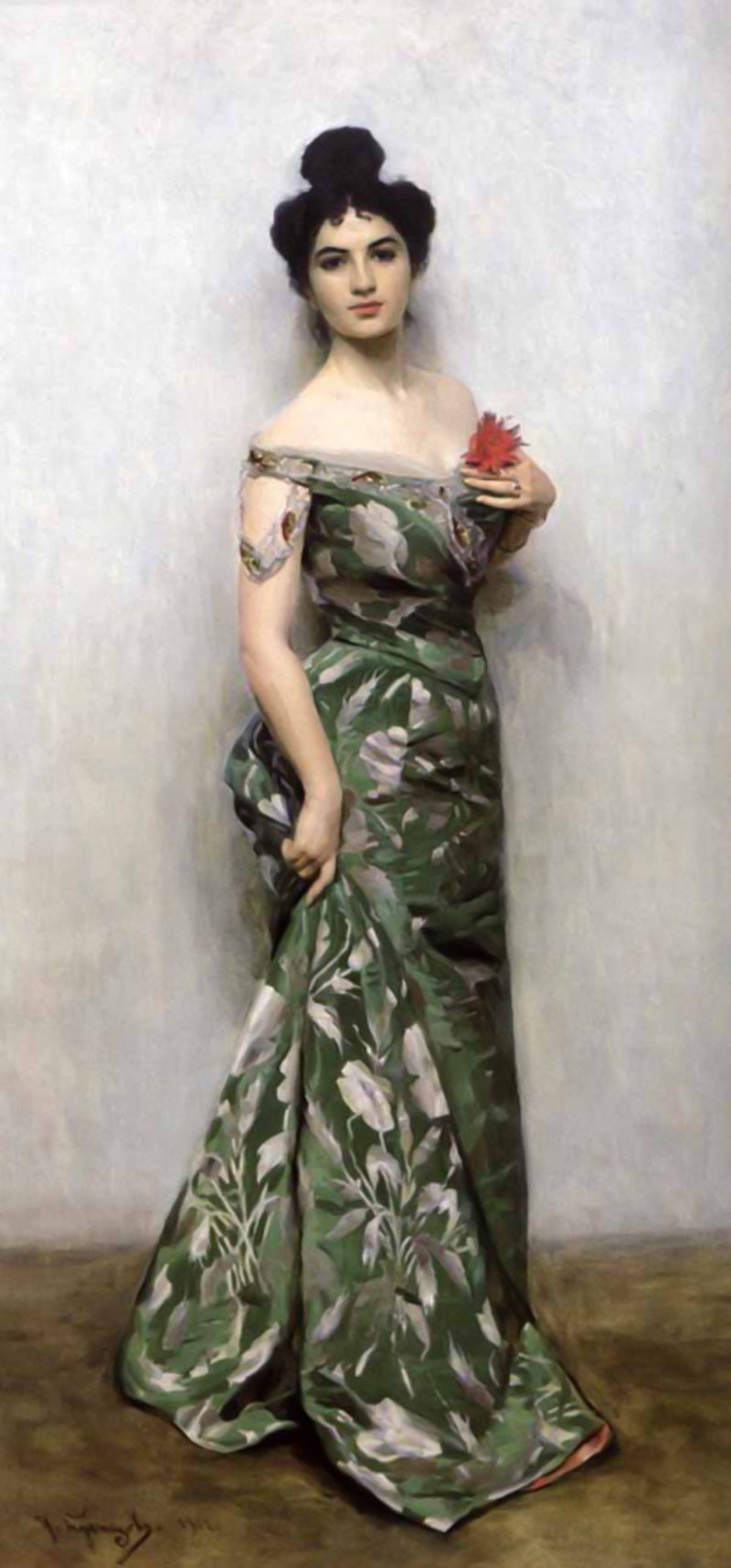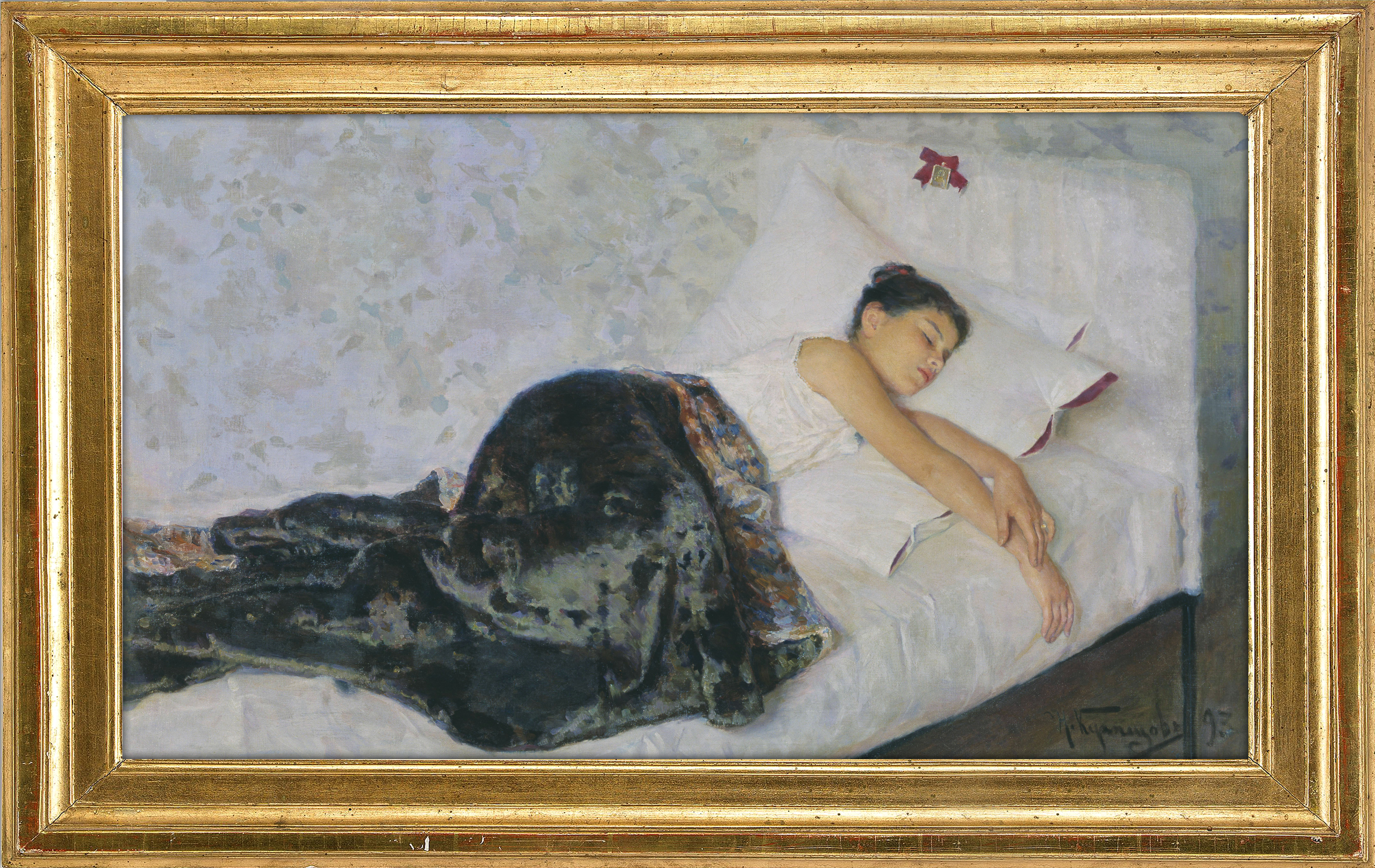 Картина «Спящая девочка», написанная в 1893 году, полна очарования и свежести. Блестящая техника живописца проявилась в тонких переливах перламутровых тонов, почти иллюзорной передаче фактуры тканей, тёплой бархатистой кожи лица и рук спящей.