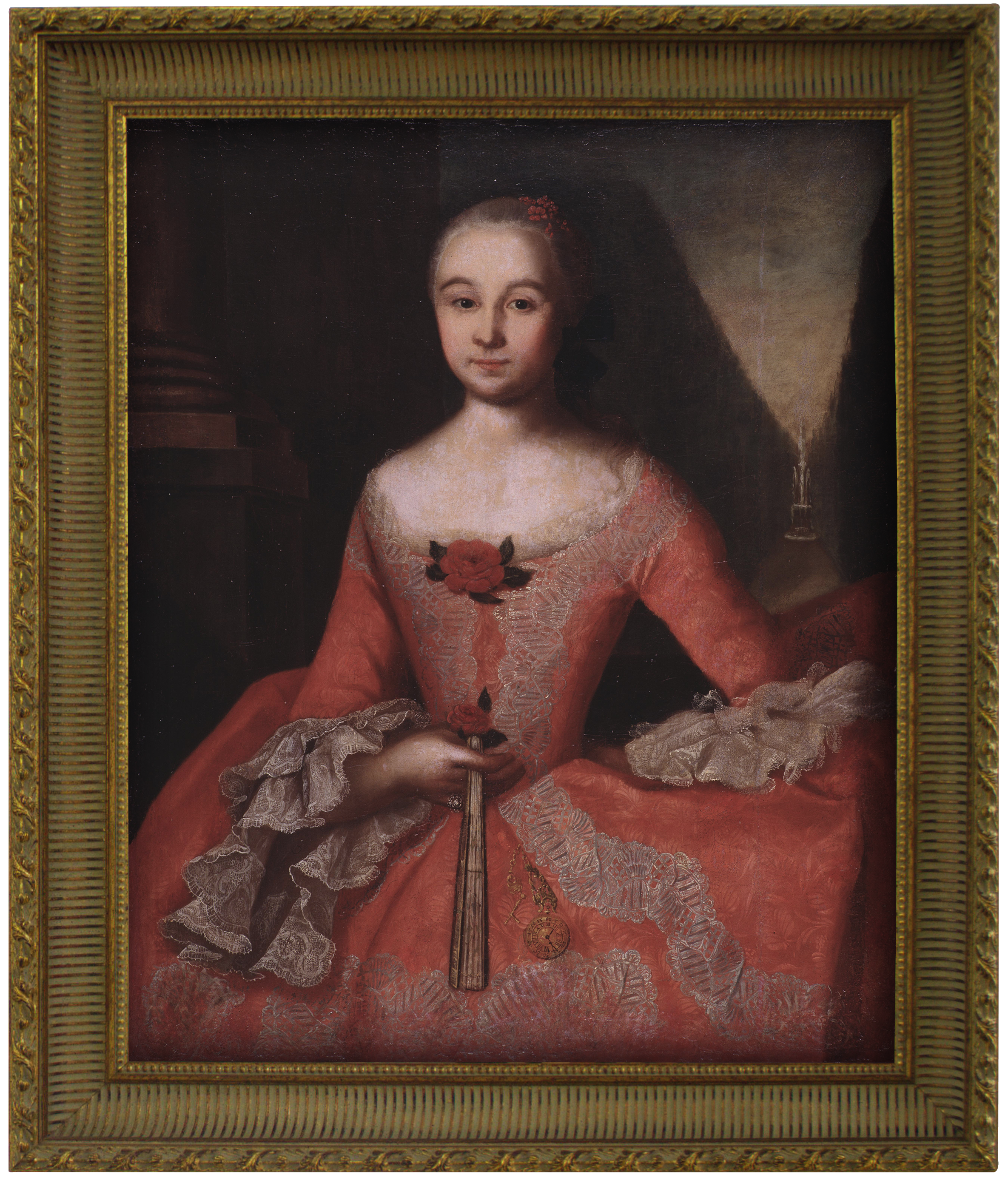 К.И. Тишинина(1736 – 1757), урождённая Тарбеева, замужем за Н.И. Тишининым с 1751 по 1757 гг. На обороте надпись: «Портрет Ауиньи Тарьбеевой представляет в полном венчальном уборе который брак был в 1752 году с Николаем Тишининым: отроду 19 лет писан в 1755 году надворным советником живописным мастером Вишняковымъ». Поступление 1927 г. от А.М. Четверикова. (РБМ-39. Ж-39).