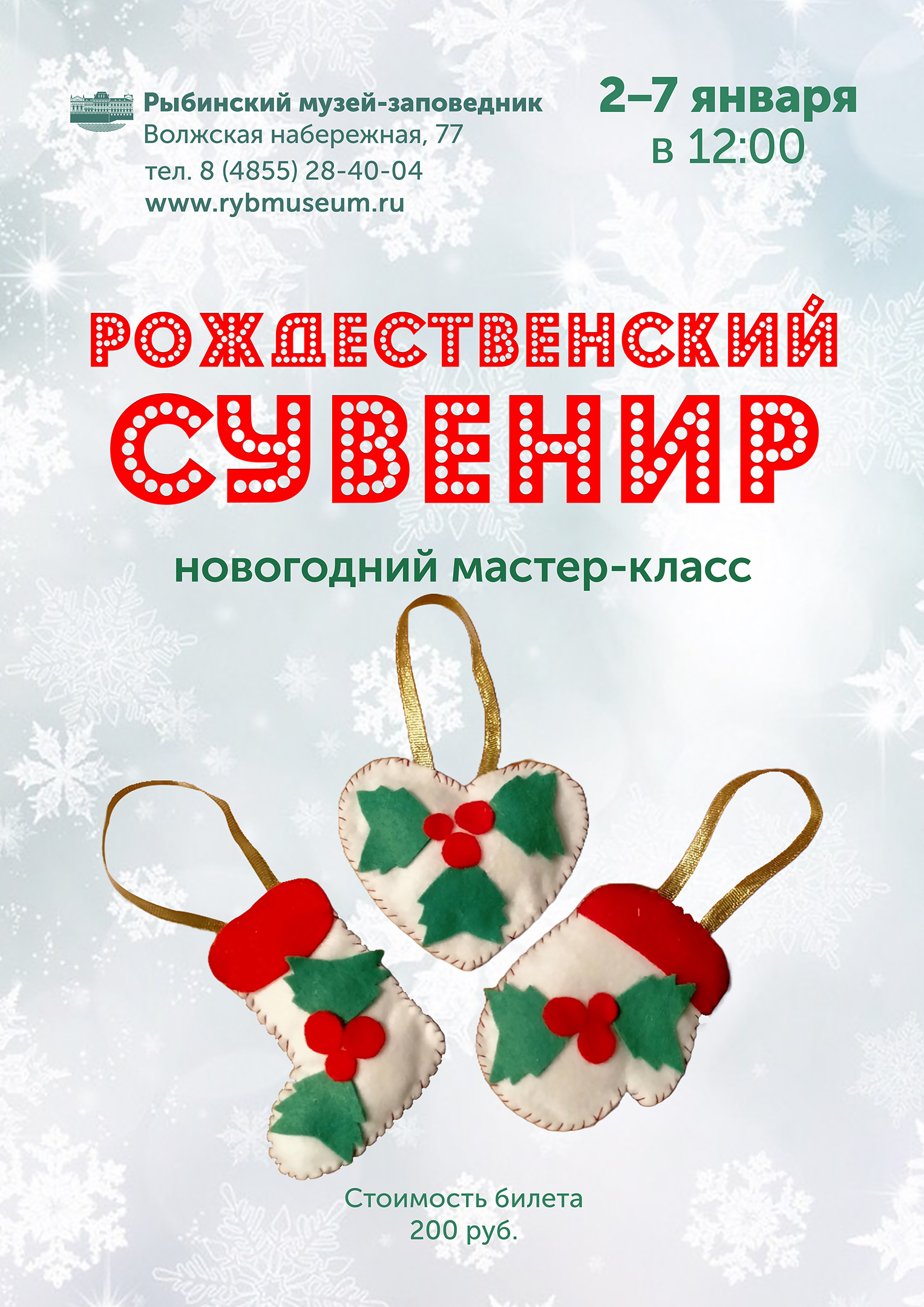 Со 2 по 7 января в 12:00 приглашаем посетить новогодний мастер-класс «Рождественский сувенир». Мастер-класс будет проходить в здании Мучного Гостиного двора (Волжская набережная, 77).