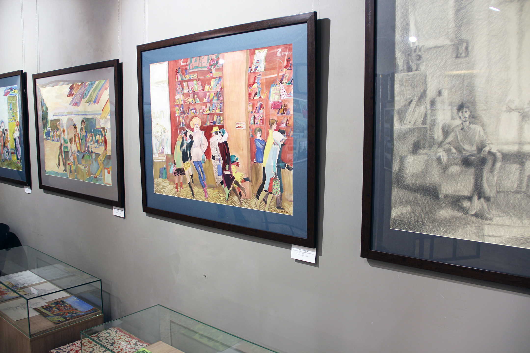 Майя Гусарина – оригинально и смело экспериментирует в композиции. Уже в ранних цветовых зарисовках 1987 года, написанных сразу после Ярославского художественного училища на основе набросков в магазине и на уличном рынке в Костроме, виден острый, чуть ироничный и меткий взгляд на окружающий калейдоскоп характеров и персонажей. Ученица прекрасного ярославского графика В.М. Серебрякова впитала лучшие уроки мастера.