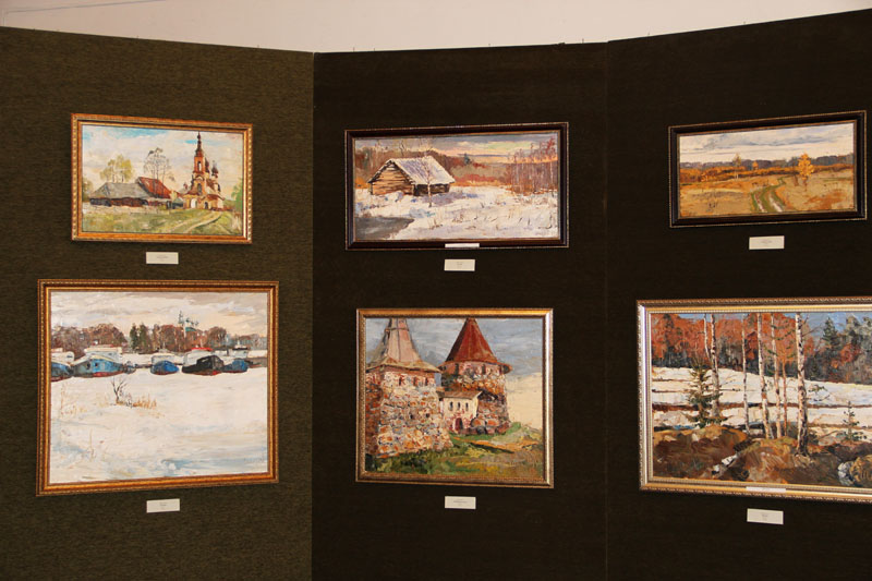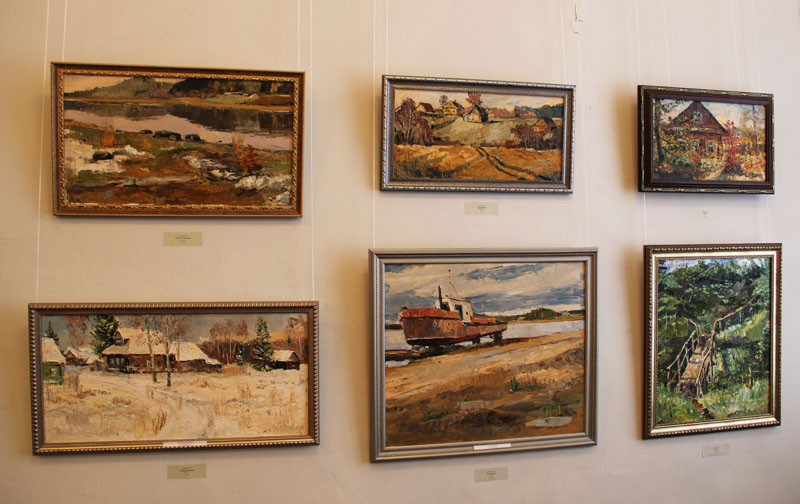 На выставке представлено около 90 работ в жанрах: пейзаж и натюрморт, преобладают, конечно, родные пейзажи российской глубинки, рыбинские мотивы.