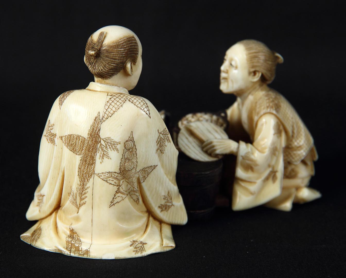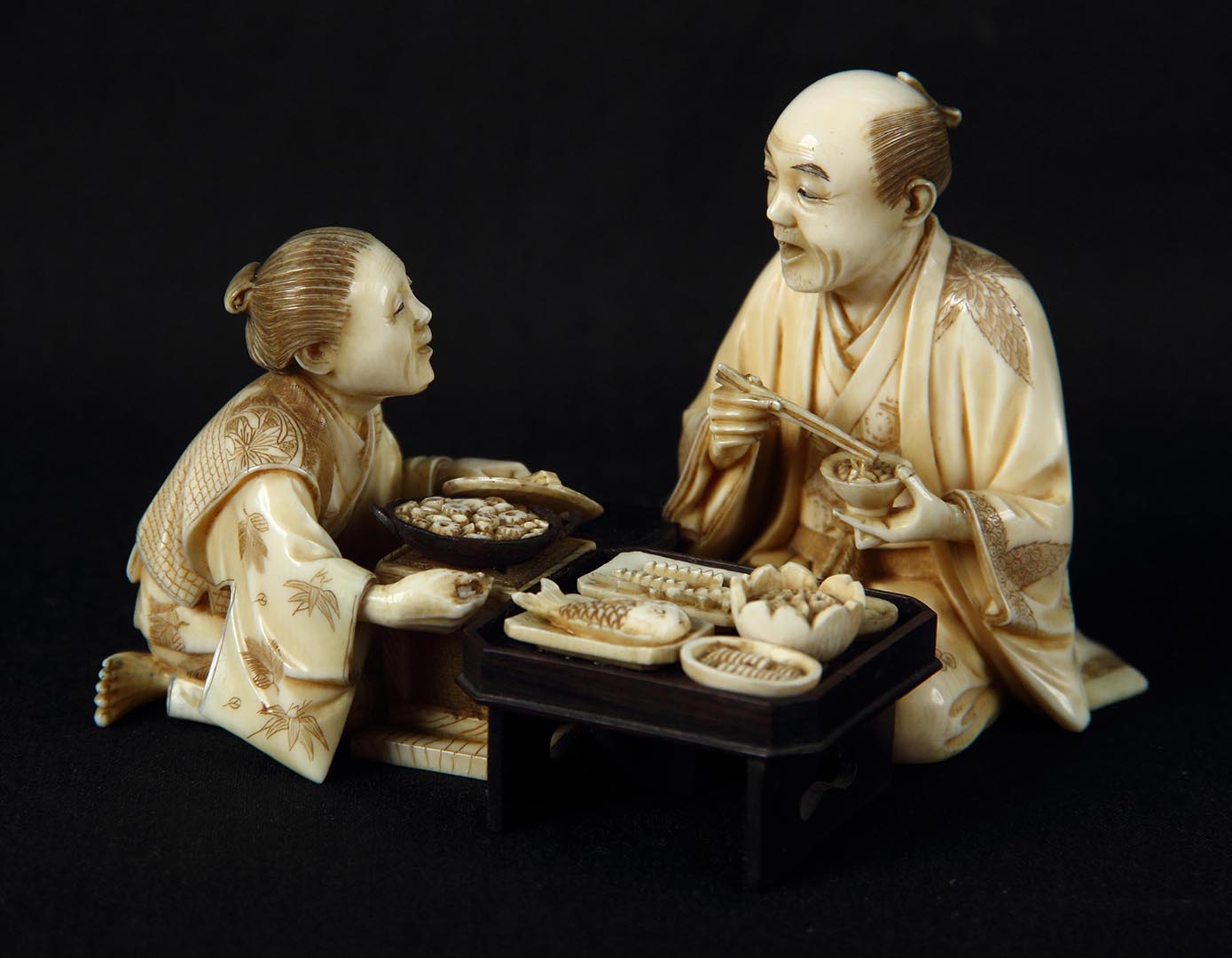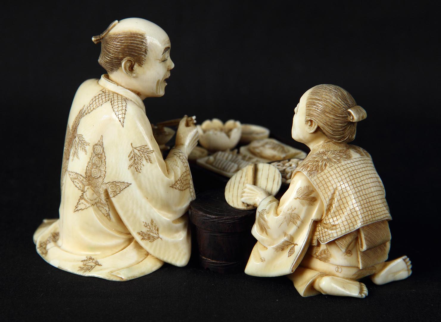 Сидзухиро (Сэйко). Окимоно «Торговка кушаньями». Эдоская школа. Япония, Эдо [Токио]. Конец XIX в. Кость слоновая, перламутр, гравировка с подцветкой
