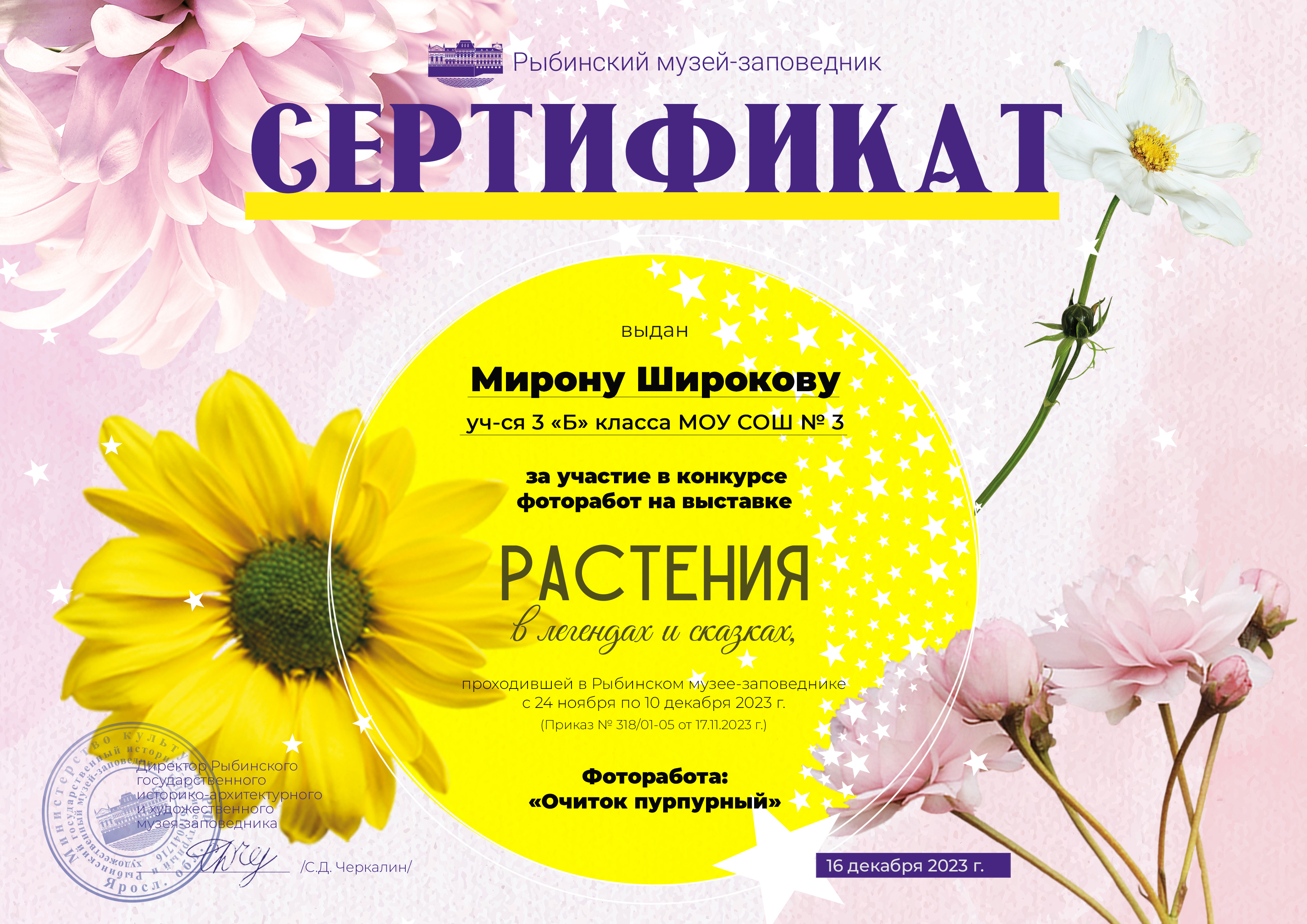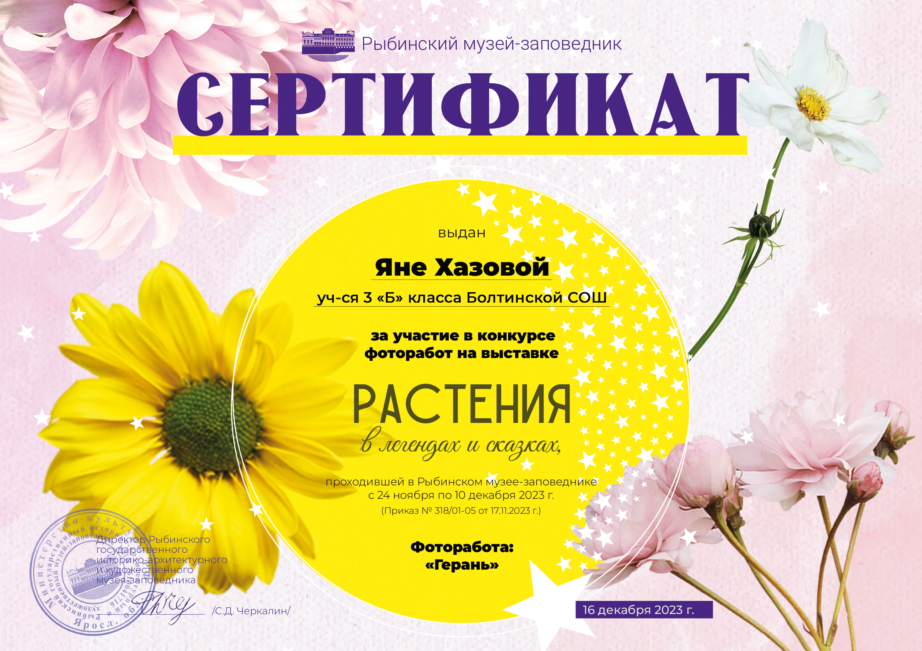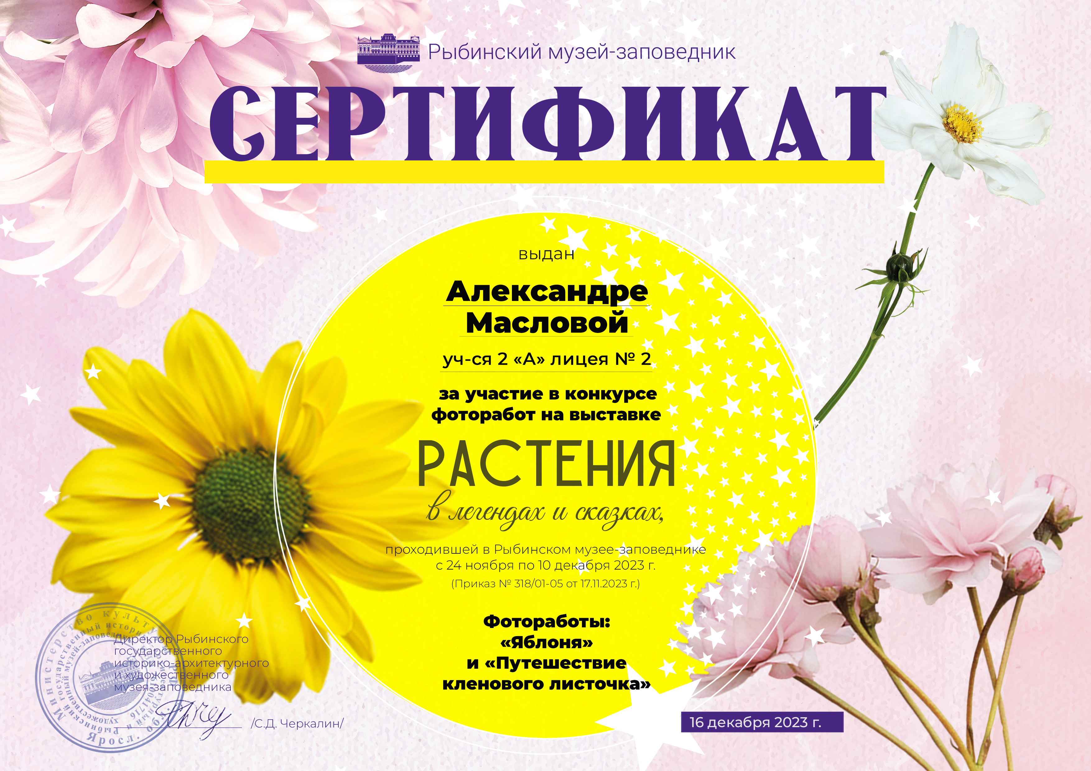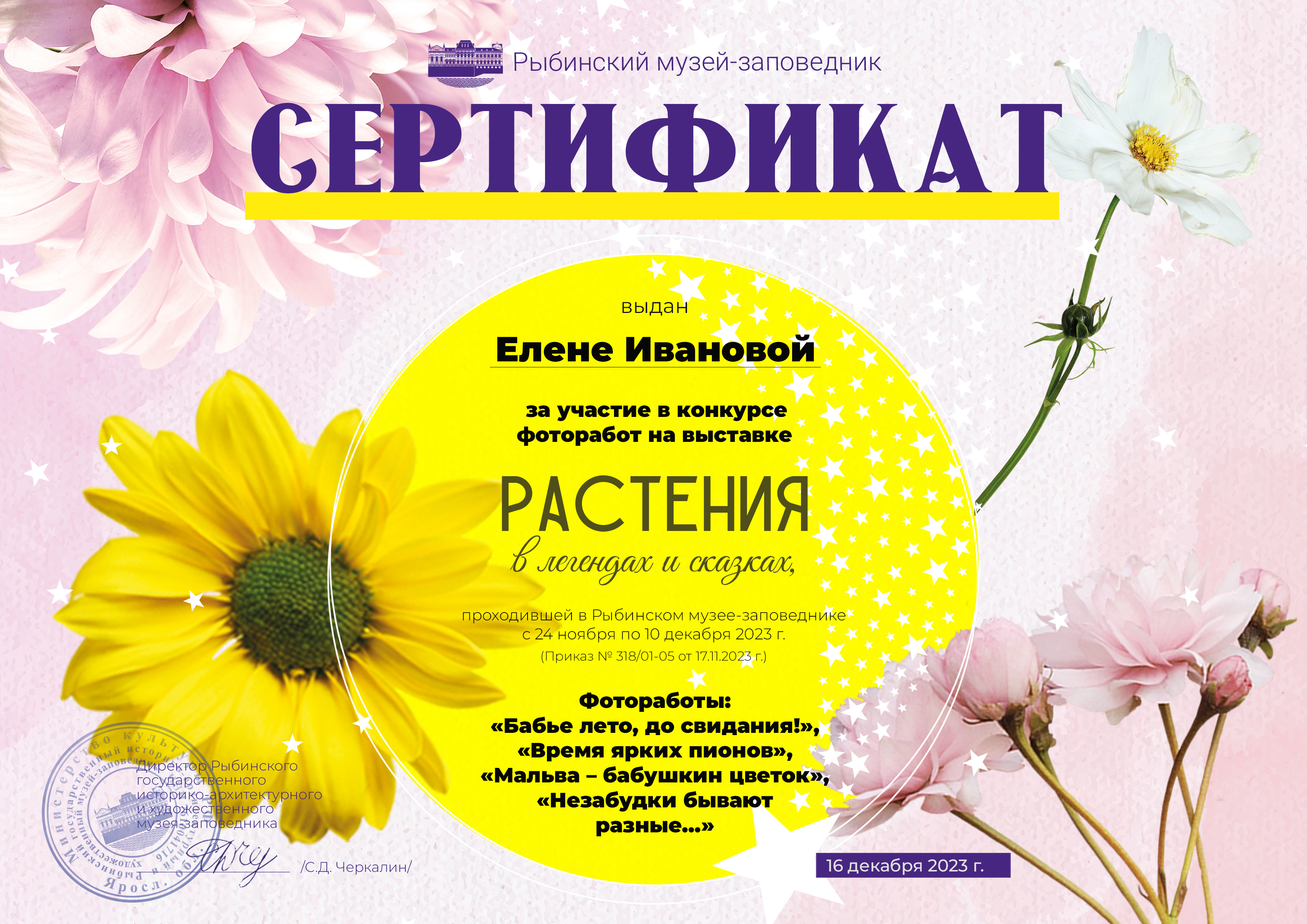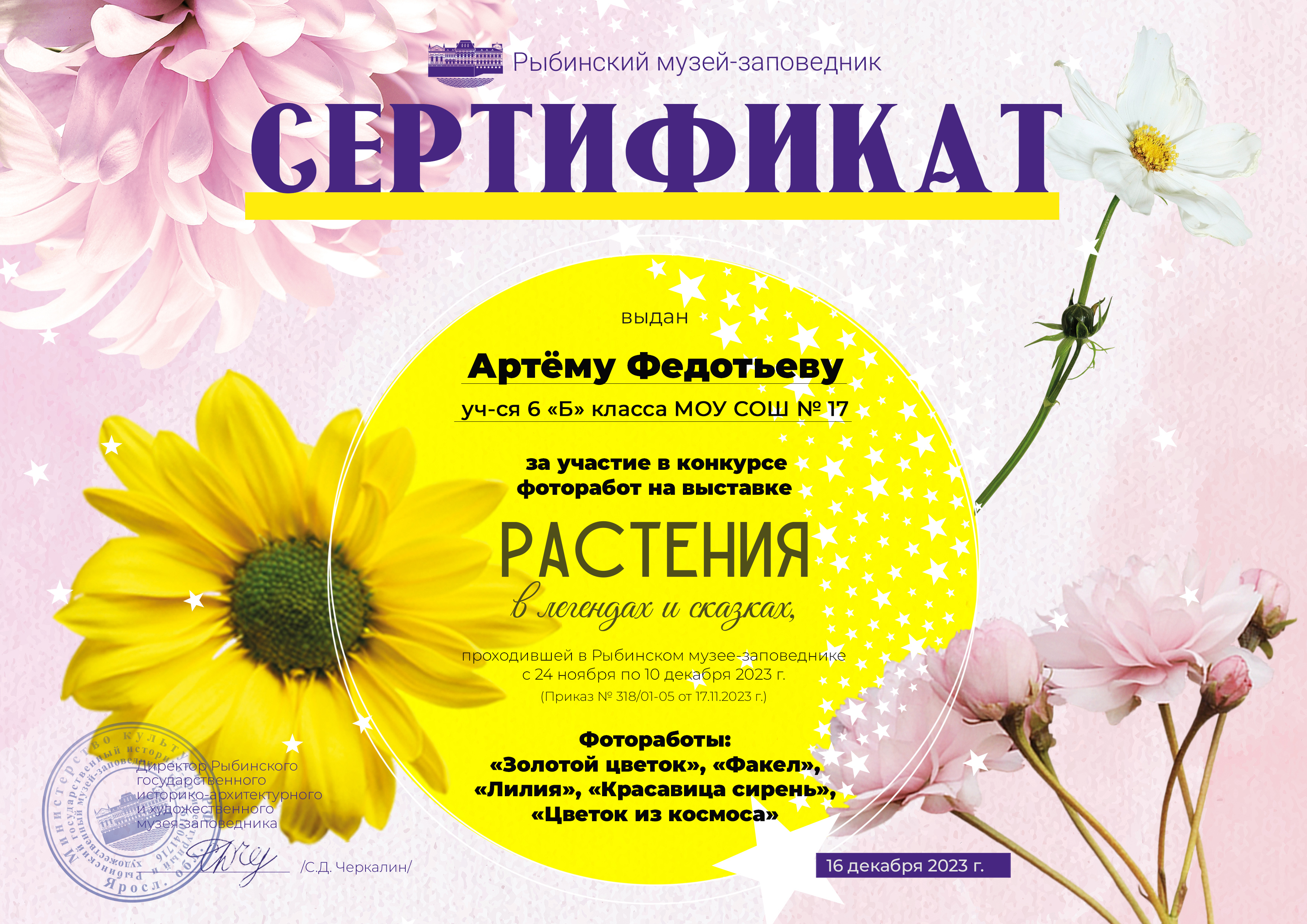 Приглашаем всех участников выставки в музей 16 декабря 2023 г. в 14:00 в здание Мучного гостиного двора. После награждения победителей конкурса и выдачи работ для участников выставки будет проведена небольшая экскурсия на выставке «Закон звезды и формула цветка».
