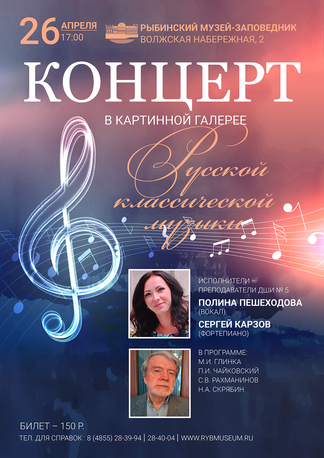 Уважаемые посетители! 26 апреля в 17:00 в Картинной галерее музея состоится концерт русской классической музыки исполнителей-преподавателей ДШИ № 5 Полины Пешеходовой (вокал) и Сергея Карзова (фортепиано).