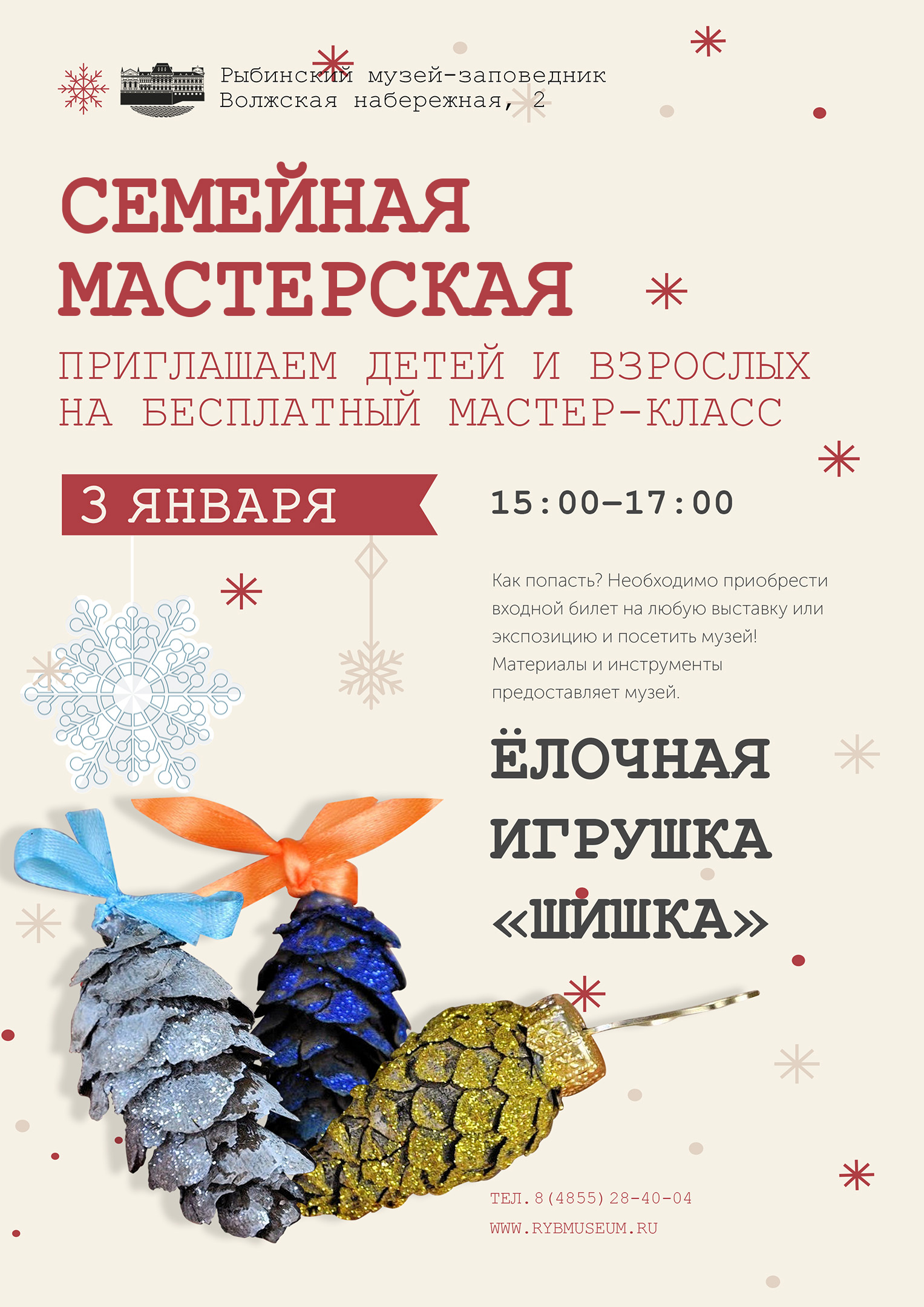 3 января 2024 г. с 15:00 до 17:00 приглашаем детей и взрослых на бесплатный мастер-класс по изготовлению ёлочной игрушки.