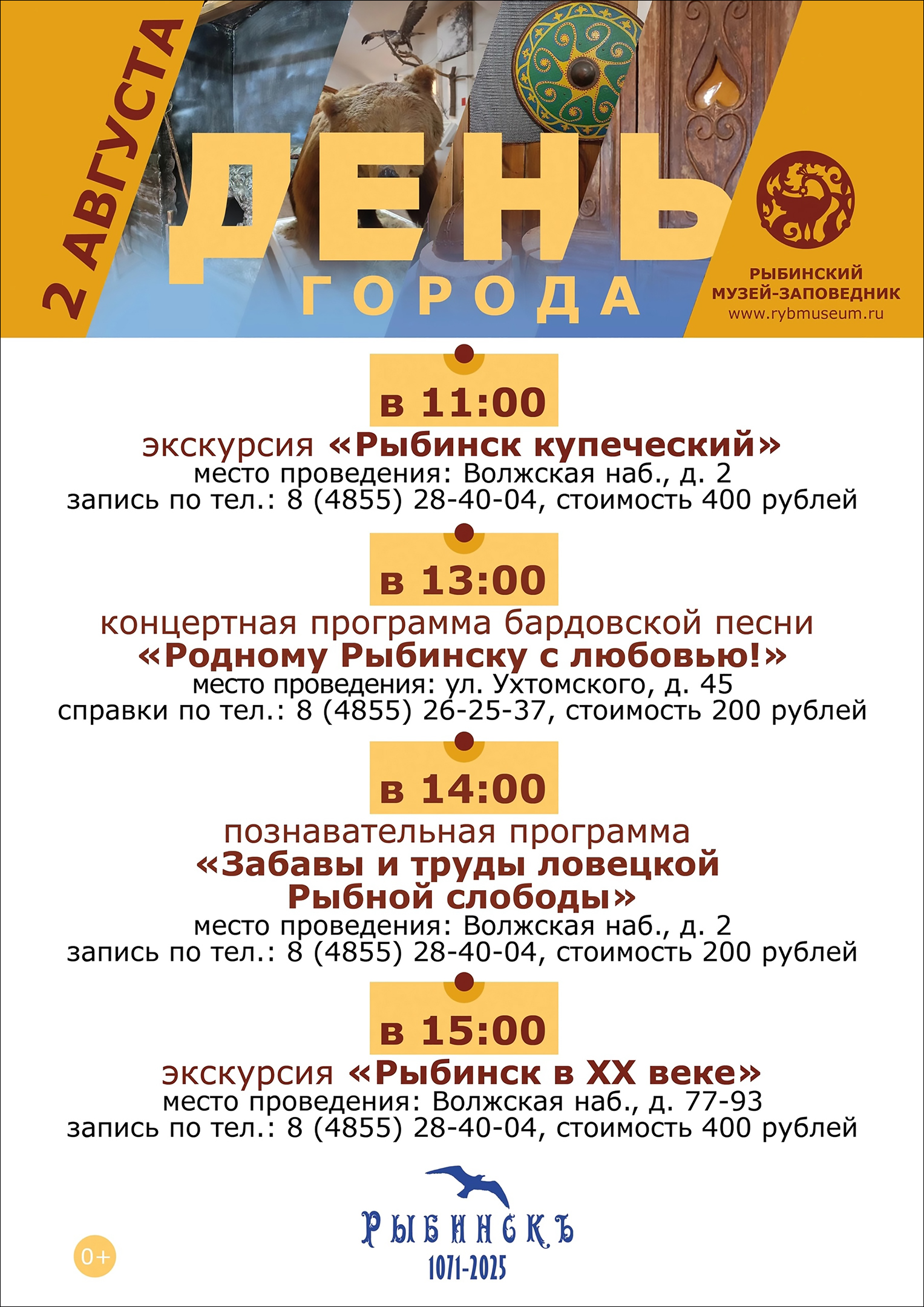 Уважаемые рыбинцы и гости города! 2 августа приглашаем принять участие в программе мероприятий, посвящённых Дню города Рыбинска.