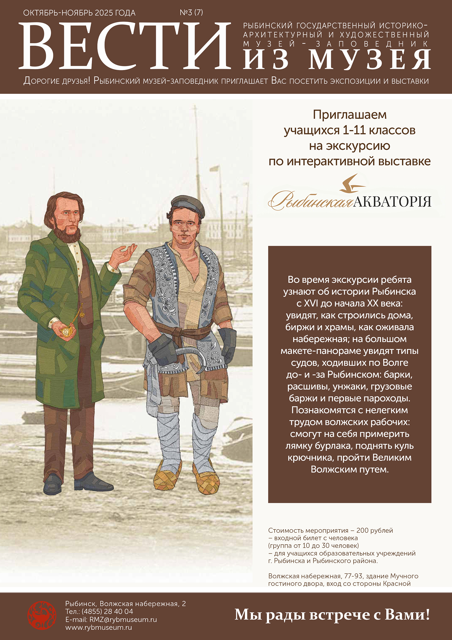 Во время экскурсии ребята узнают об истории Рыбинска с XVI до начала XX века: увидят, как строились дома, биржи и храмы, как оживала набережная; на большом макете-панораме увидят типы судов, ходивших по Волге до- и -за Рыбинском: барки, расшивы, унжаки, грузовые баржи и первые пароходы.