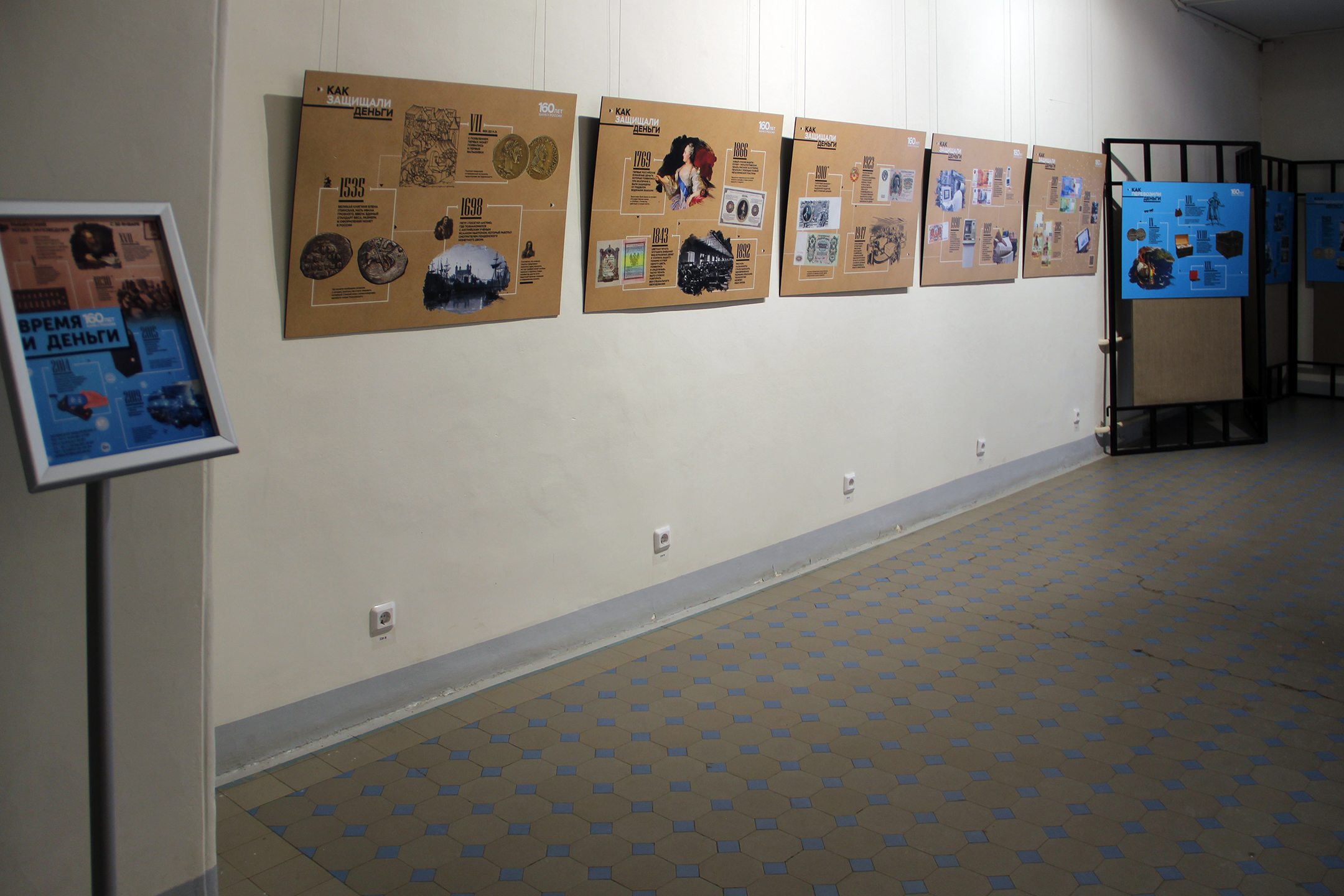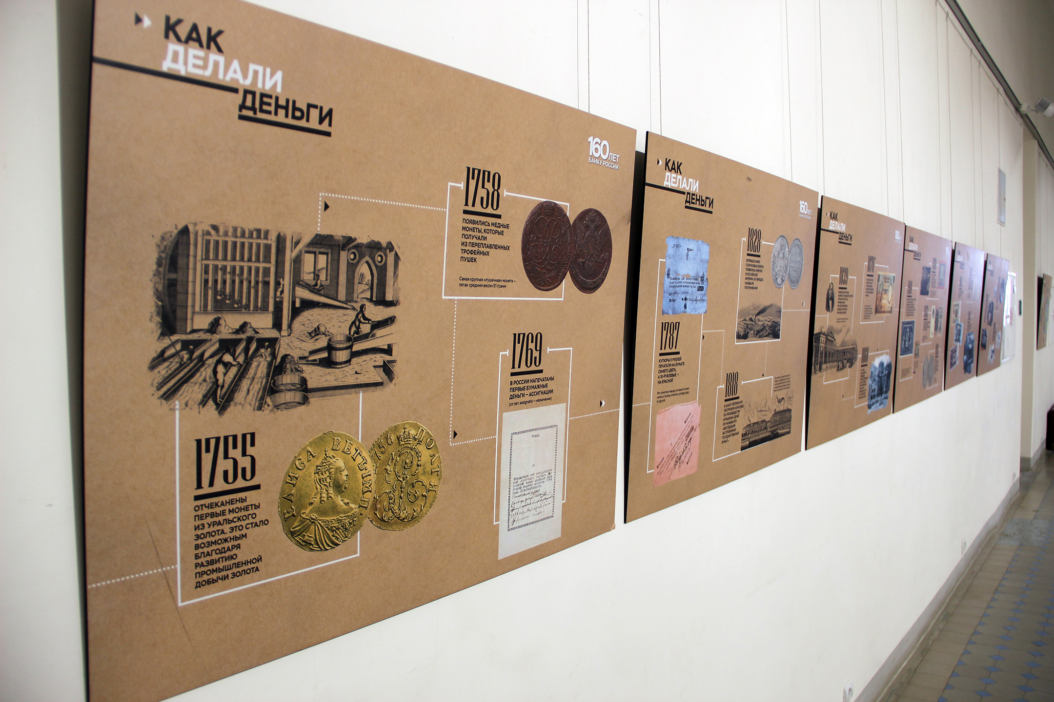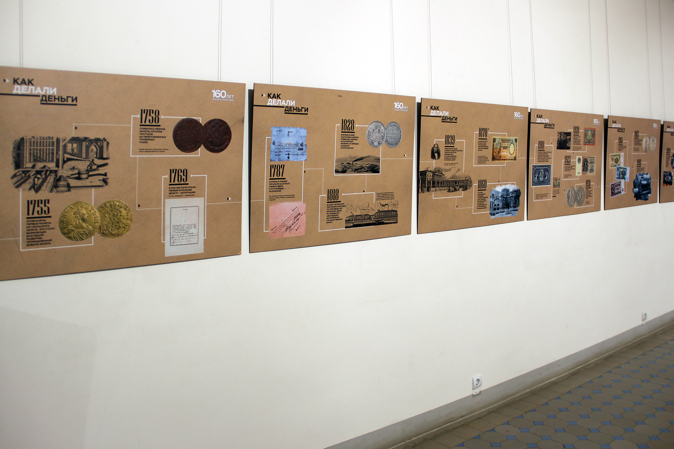 В основе выставки – фотопанно с увеличенными изображениями металлических и бумажных денежных знаков из коллекции Музея Банка России. Перед зрителем предстаёт многообразие денег российского государства, начиная от монет Петра I до современных денег. Изображения банкнот дополнены короткими интересными фактами из истории денежного дела.