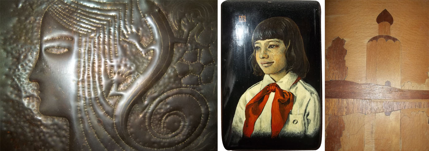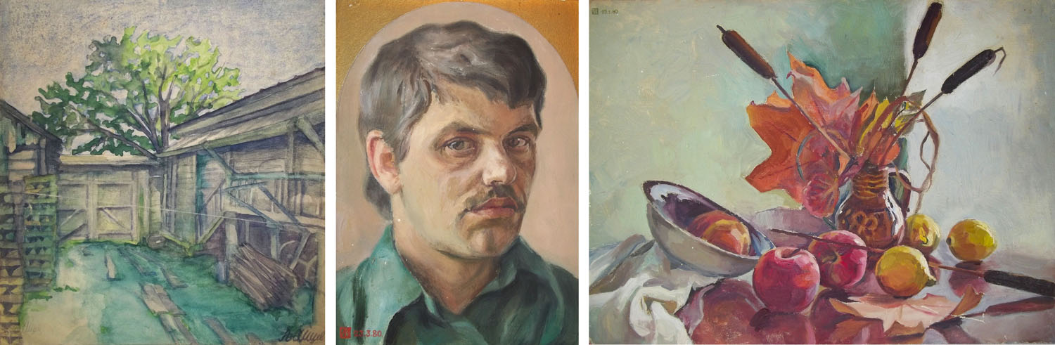 Дворик. Гороховец. 1954 г. Б., акв. Автопортрет. 1980 г. К., м. Осенний натюрморт. 1980 г. К., м.