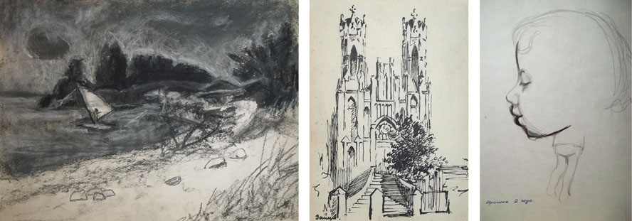 «Белеет парус одинокий». Коприно. 1987 г. Б., соус. Рыбинский костёл. 1970-е гг. «Иришке 2 года». 1974 г. Б., кар.