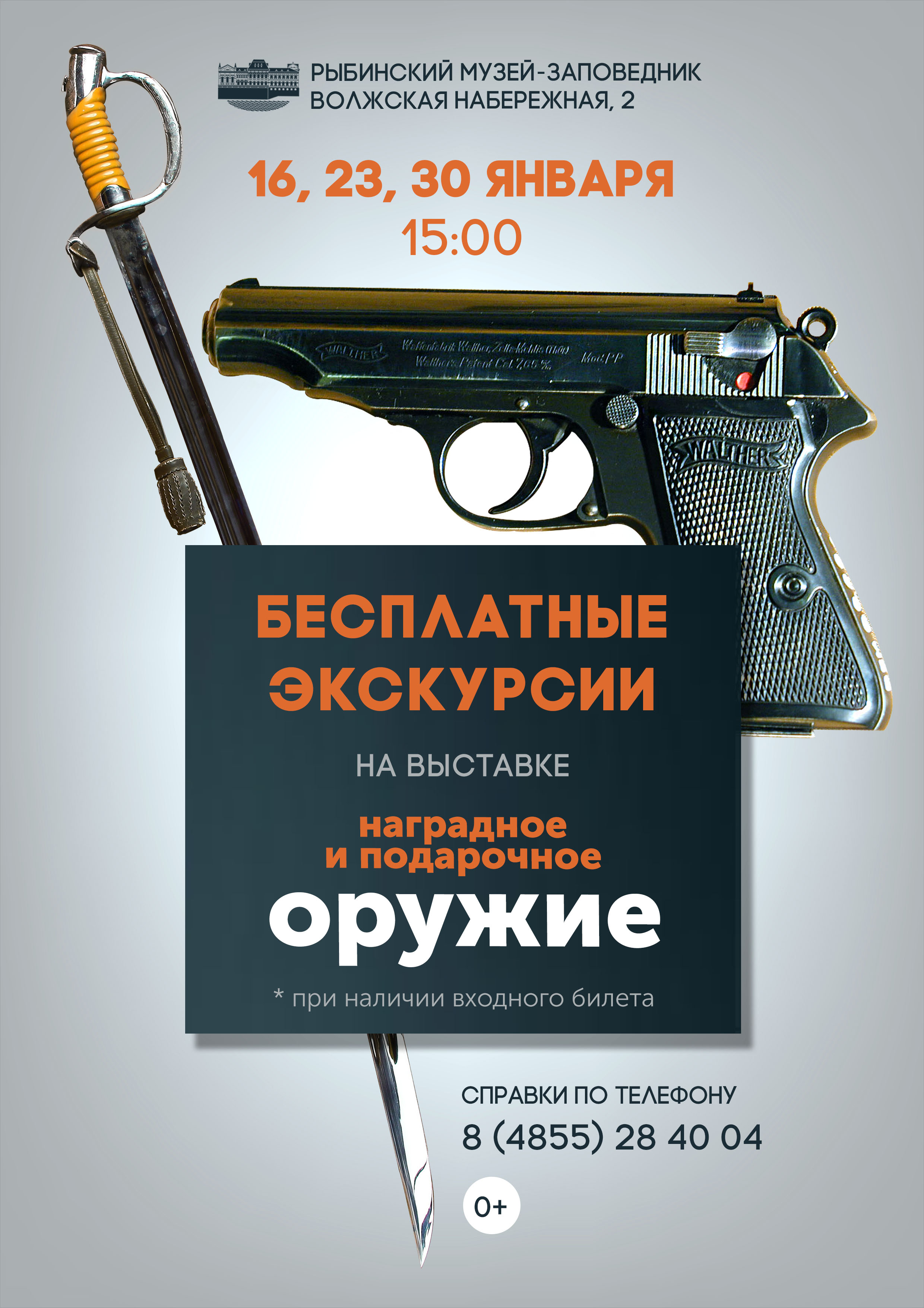 Уважаемые горожане и гости города! 16, 23 и 30 января приглашаем Вас на Бесплатные экскурсии на выставке «Наградное и подарочное оружие».