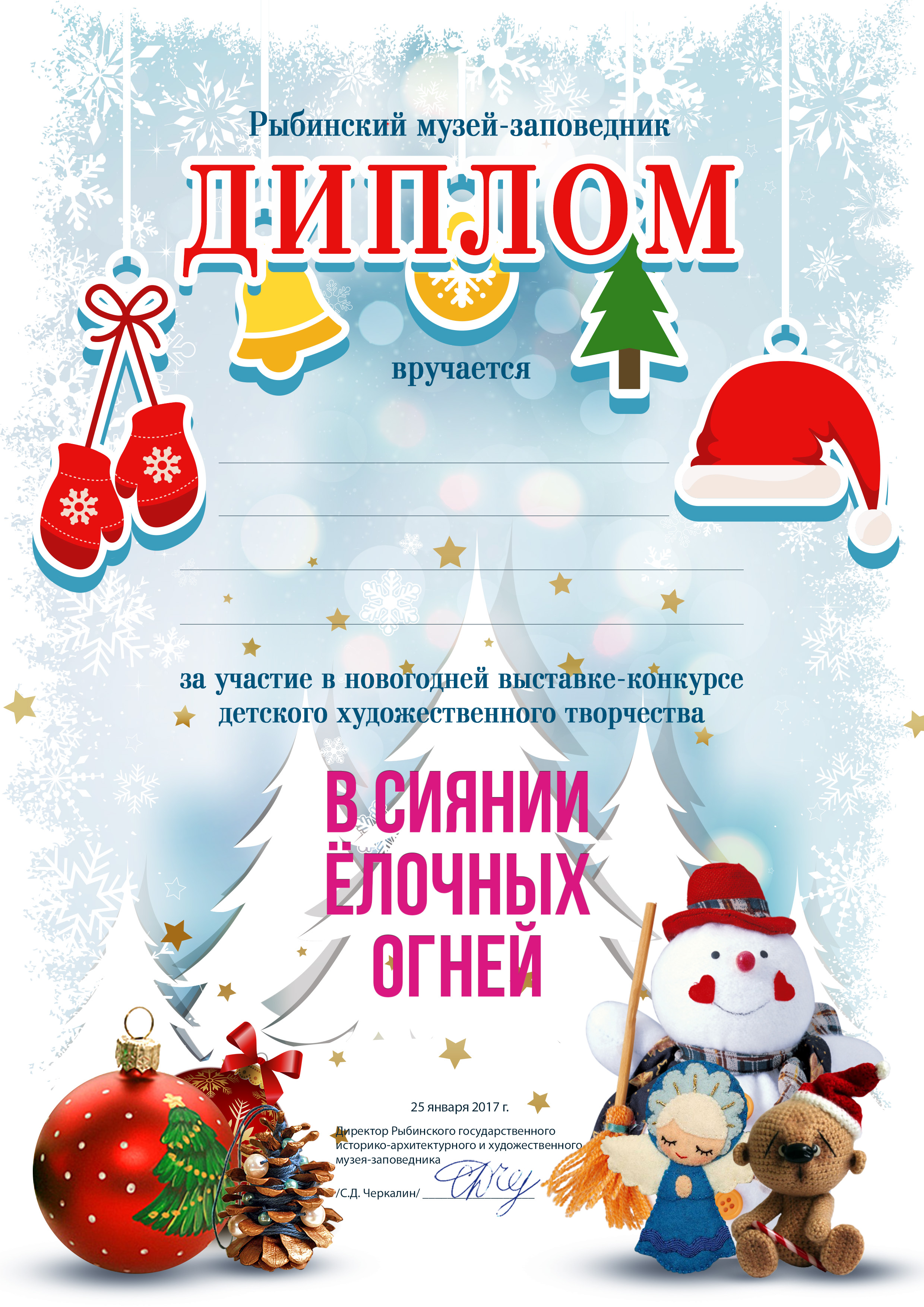 Все остальные участники выставки с 16 января могут скачать здесь Диплом участника выставки «В сиянии ёлочных огней». Заполненные дипломы можно заверить на базе нашего учреждения.